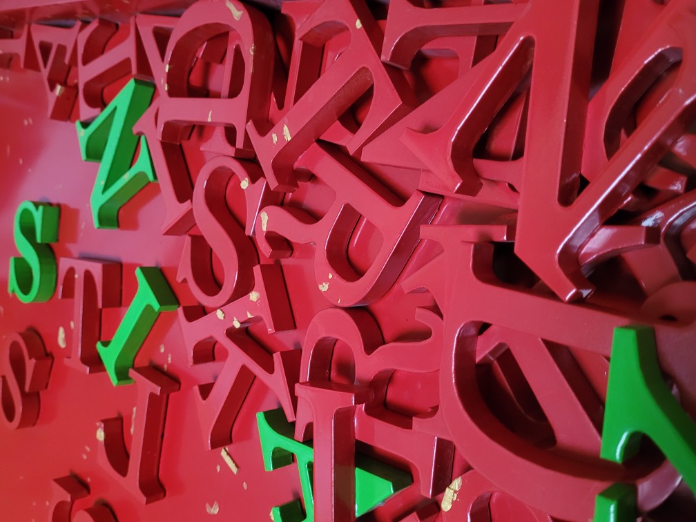 Aus diesem rot-grünen Salat sollte nun also ein Kunstwerk entstehen. Die Frage, wie ich ohne die Buchstaben „m“ und „o“ das Wort „Demokratie“ bilden könnte, verschob ich auf später. Erst einmal musste der Werbespruch weichen. Nach einigem Hin- und Herwenden beschloss ich, das Motiv um 180 Grad zu drehen und keine Buchstaben nachzubauen oder zu kaufen, denn in einer Demokratie ist das Prinzip der beschränkten Auswahl, die trotzdem den vollen Sinn ergeben soll, ja durchaus üblich.