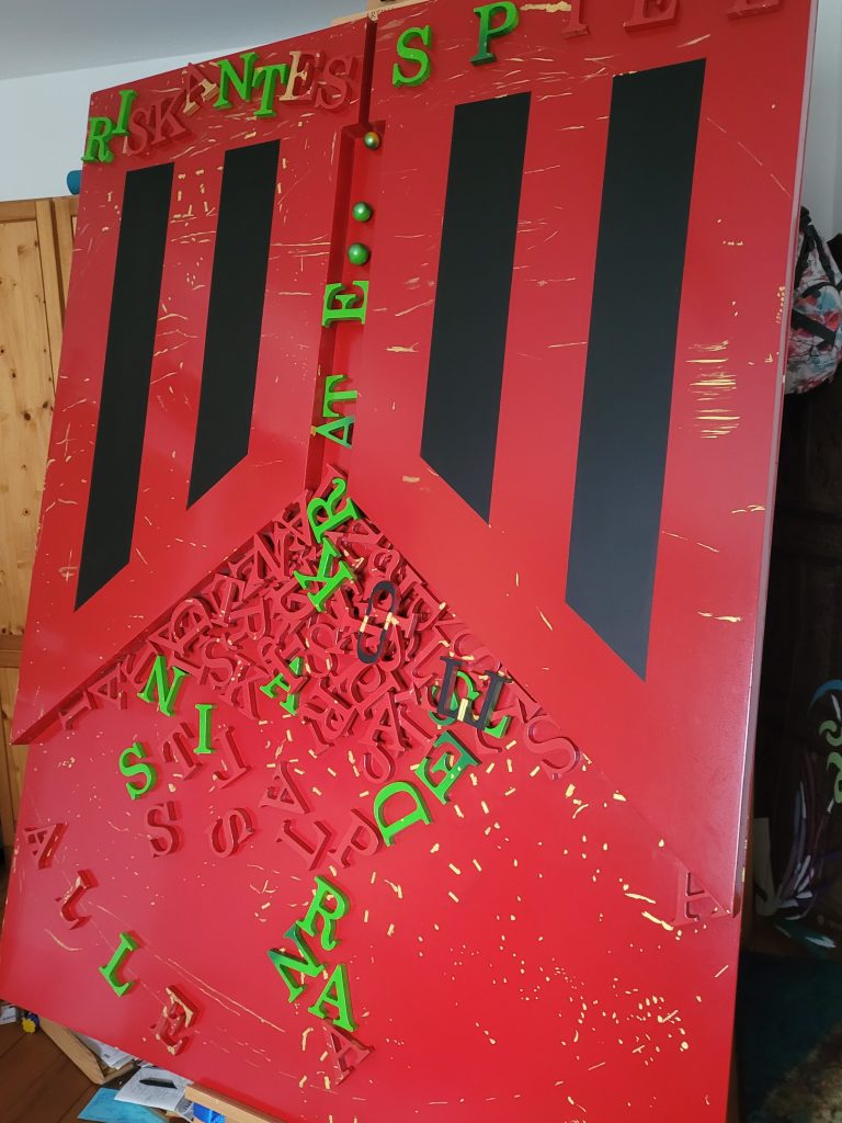 Die materielle Basis dieses Werkes – im weiteren Text werde ich es „Werkstoff“ nennen – habe ich Ende Juni ’25 vor dem Müllcontainer gerettet. Einige Buchstaben auf dem Bild leuchteten geradezu an. In meinem Kopf entstand daraus das Wort „Demokratie“. Obwohl sehr unhandlich und der Transport nicht so leicht zu organisieren, musste es einfach mit.